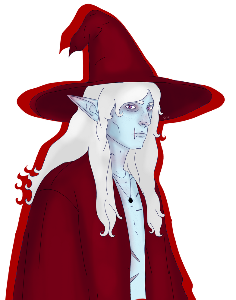 Hexen is a strikingly lanky young man, characterized by his long, thin, pointy nose, small lips, and gaunt cheeks. A beauty mark graces his upper lip, offset by a vertical scar on the opposite side. Dark circles linger under his icy eyes, and his perpetually furrowed thick eyebrows lend him a tortured, tired expression. His features, though austere, retain a quiet kindness. With a sharp jawline and a long, chin, his emaciated appearance contributes to his overall skeletal look alongside his light-bluish pale skin.Hidden beneath his long, wavy silver hair are elongated, pointy ears that are highly sensitive to sound and temperature. His frame is defined by slender legs, narrow hips, and broad shoulders, forming a triangular silhouette that perfectly suits his favoured flowing robes.Hexen is unsettlingly thin, to the point of appearing unhealthy. His clothes seem to swallow him, and his bones are palpable at the slightest touch. This lack of natural padding often makes him adopt peculiar sitting positions to minimize discomfort. Adding to his mystique is his scent—an unusual yet oddly pleasant aroma of sweet alchemy.His hands are bony, with long, spider-like fingers, and he rarely exposes more skin than his neck and hands. Even in these limited glimpses, a myriad of scars can be seen, appearing in unusual places and hinting at a tumultuous history. Hexen’s teeth are unnervingly sharp, a jagged, predatory set that resembles a bear trap. His right eye bears a permanently dilated pupil (anisocoria), adding to his unsettling appearance.His voice is low and hypnotic, with a formal, gentle tone as though he’s always reciting poetry.Hexen’s gaunt and scrawny appearance can evoke a range of reactions—spooky, melancholic, unique, or even charming—all at once. Despite his eerie looks, Hexen is meticulous in his self-care, though his ongoing health issues take a toll on his appearance. Bloodshot eyes, chapped lips, and reddened nostrils are not uncommon, and his delicate frame bruises easily. The sight of him patched up and bandaged has become something of a trademark, often accompanied by an array of excuses for the origins of his injuries.